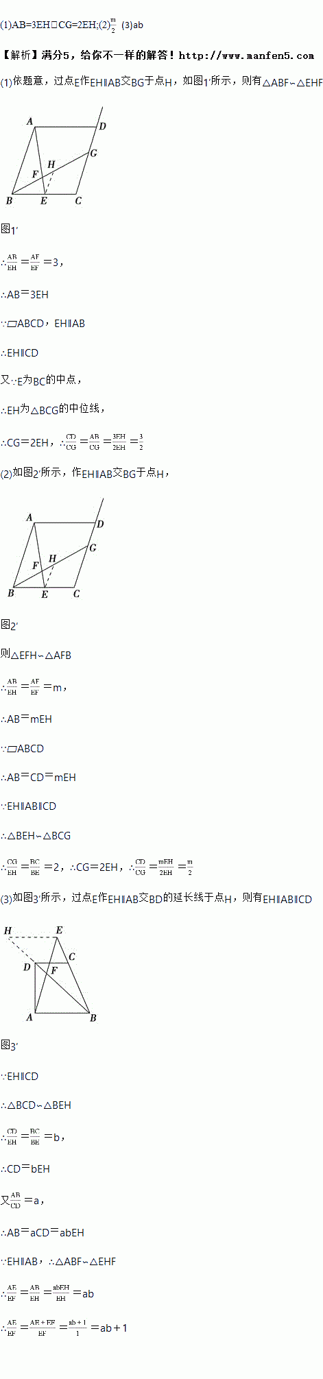 类比、转化、从特殊到一般等思想方法,在数学学习和研究中经常用到,如下是一个案例,请补充完整,原题:如图1,在平行四边形ABCD中,点E是BC的中点,点F是线段AE上一点,BF的延长线交射线CD于点G.若