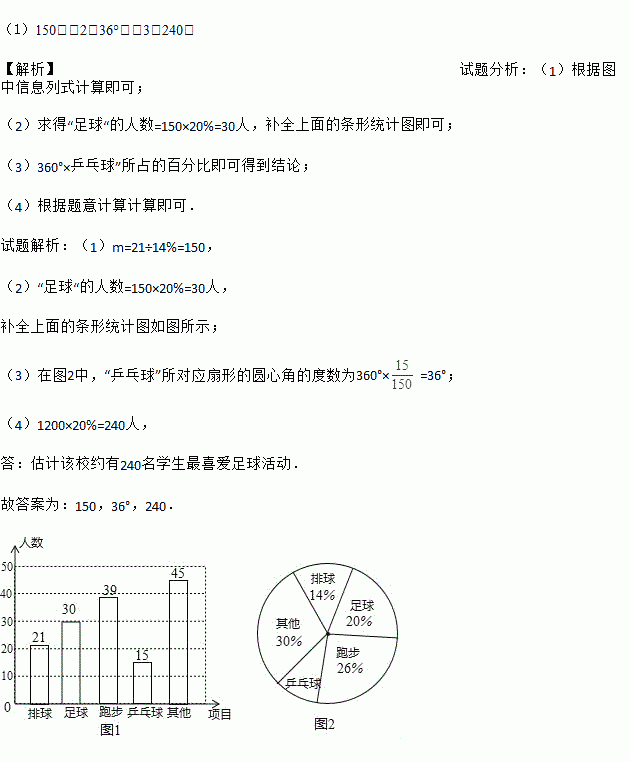 (3)在图2中,“乒乓球”所对应扇形的圆心角的度数为 ;
