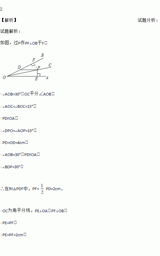 如图,∠AOB=30度,OC平分∠AOB,P为OC上一点,PD∥OA交OB于D,PE垂直OA于E,若OD=4cm,求PE的长.