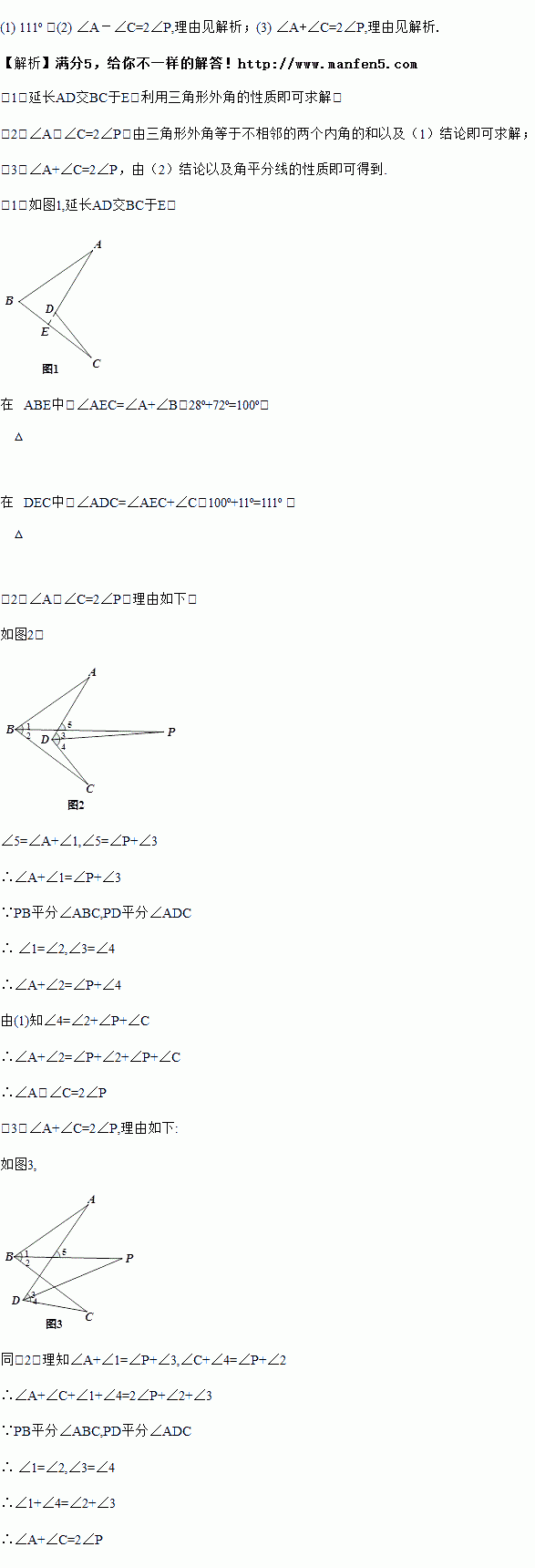 (3)如图3,在 (2)的条件下,将点D移至∠ABC的外部,其它条件不变,探究∠A,∠P,∠C的关系并证明.