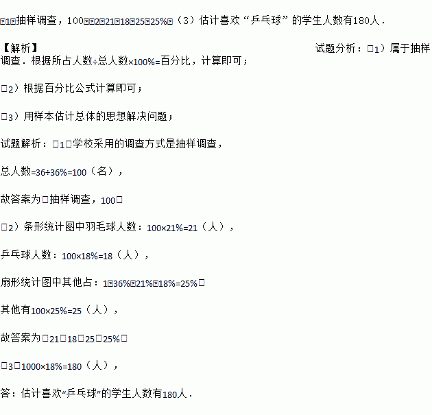 (1)抽样调查,100;(2)21,18,25,25%;(3)估计喜欢“乒乓球”的学生人数有180人. 【解析】试题分析:(1)属于抽样调查.根据所占人数÷总人数×100%=百分比,计算即可; (2)根据百分比公式计算即可; (3)用样本估计总体的思想解决问题; 试题解析:(1)学校采用的调查方式是抽样调查, 总人数=36÷36%=100(名), 故答案为:抽样...