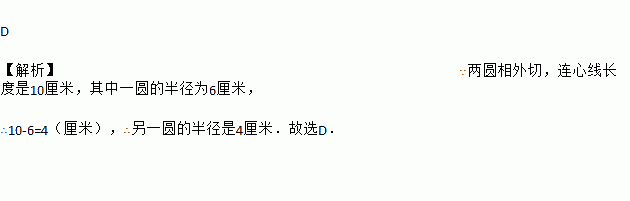 已知两圆相外切,连心线长度是10厘米,其中一圆的半径为6厘米,则另一圆的半径是 ( )