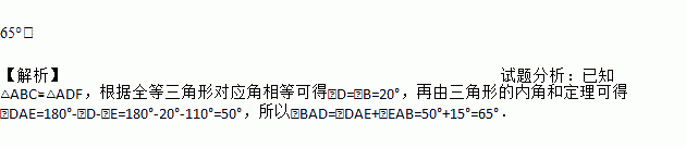 如图,△ABC≌△ADE,AB=AD,AC=AE,∠B=20°,∠E=110°,∠EAB=15°,则∠BAD的度数为______________.