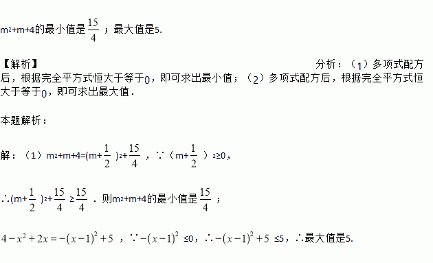 m2+m+4的最小值是;最大值是5. 【解析】分析:(1)多项式配方后,根据完全平方式恒大于等于0,即可求出最小值;(2)多项式配方后,根据完全平方式恒大于等于0,即可求出最大值. 本题解析: 【解析】 (1)m2+m+4=(m+)2+,∵(m+)2≥0, ∴(m+)2+≥.则m2+m+4的最小值是; ,∵≤0,∴≤5,∴最大值是5.