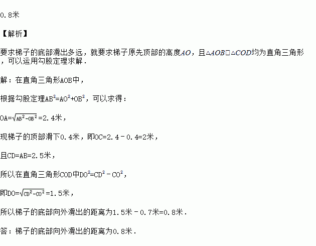 一驾2.5米长的梯子靠在一座建筑物上,梯子的底部离建筑物0.7米,如果梯子的顶部滑下0.4米,梯子的底部向外滑出多远(其中梯子从AB位置滑到CD位置)?