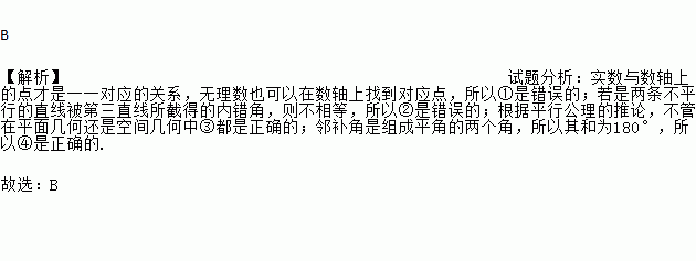 下列命题中:①.有理数和数轴上的点一一对应;②.内错角相等;③.平行于同一条直线的两条直线互相平行;④.邻补角一定互补.其中真命题的个数是( )