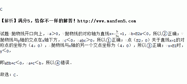 如图所示的抛物线是二次函数y=ax2+bx+c(a≠0)的图象,则下列结论:①abc>0;②b+2a=0;③抛物线与x轴的另一个交点为(4,0);④a+c>b,其中正确的结论有( )