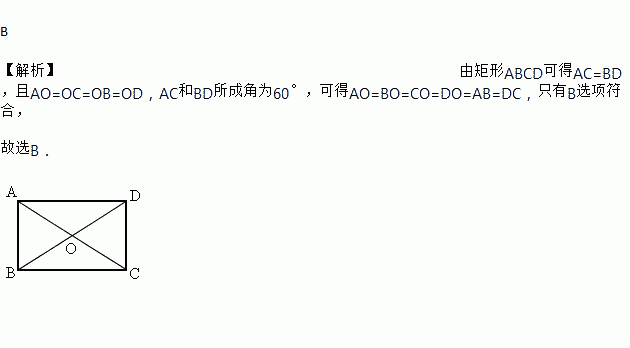 B 【解析】由矩形ABCD可得AC=BD,且AO=OC=OB=OD,AC和BD所成角为60°,可得AO=BO=CO=DO=AB=DC,只有B选项符合, 故选B.