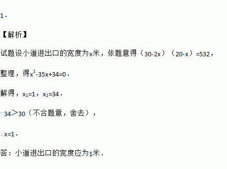 如图,是一个长为30m,宽为20m的矩形花园,现要在花园中修建等宽的小道,剩余的地方种植花草.如图所示,要使种植花草的面积为532m2,那么小道进出口的宽度应为 米.