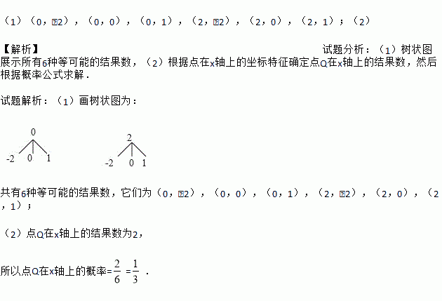 (1)(0,﹣2),(0,0),(0,1),(2,﹣2),(2,0),(2,1);(2) 【解析】试题分析:(1)树状图展示所有6种等可能的结果数,(2)根据点在x轴上的坐标特征确定点Q在x轴上的结果数,然后根据概率公式求解. 试题解析:(1)画树状图为: 共有6种等可能的结果数,它们为(0,﹣2),(0,0),(0,1),(2,﹣2),(2,0),(2,1); (2)点Q...