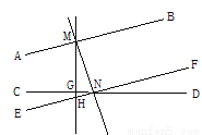 如图,MN⊥AB,垂足为M点,MN交CD于N,过M点作MG⊥CD,垂足为G,EF 过点N点,且EF∥AB,交MG于H点,其中线段GM的长度是________到________的距离, 线段MN的长度是________到________的距离,又是_______的距离,点N到直线MG 的距离是___.