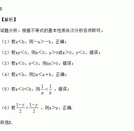 B 【解析】 试题分析:根据不等式的基本性质依次分析各项即可。 (1)若a<b,则-a>-b,正确; (2)若xy<0,则x<0,y>0或x>0,y<0,错误; (3)若x<0,y<0,则xy>0,错误; (4)若a<b,则2a<a+b,正确; (5)若a<0<b,则,错误; (6)若,则x>y,正确. 故选B.