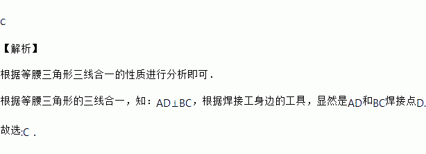 如图是人字形屋架的设计图,由AB,AC,BC,AD四根钢条焊接而成,其中A,B,C,D为焊接点,且AB=AC,D为BC的中点,现在焊接所需的四根钢条已截好,且已标出BC的中点,如果焊接工身边只有可检验直角的角尺,那么为了准确迅速地焊接,他首先应取的两根钢条及焊接点是( )