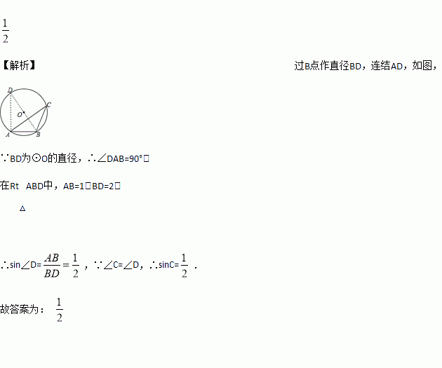 如图,⊙O的直径为2,弦AB=1,点C为优弧AB上一点,则SinC=____________.
