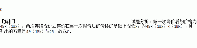 某种药品原价为49元/盒,经过连续两次降价后售价为25元/盒.设平均每次降价的百分率为x,根据题意所列方程正确的是( )