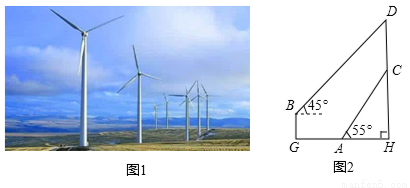风电已成为我国继煤电、水电之后的第三大电源,风电机组主要由塔杆和叶片组成(如图1),图2是从图1引出的平面图.假设你站在A处测得塔杆顶端C的仰角是55°,沿HA方向水平前进43米到达山底G处,在山顶B处发现正好一叶片到达最高位置,此时测得叶片的顶端D(D、C、H在同一直线上)的仰角是45°.已知叶片的长度为35米(塔杆与叶片连接处的长度忽略不计),山高BG为10米,BG⊥HG,CH⊥AH,求塔杆CH的高.(参考数据:tan55°≈1.4,tan35°≈0.7,sin55°≈0.8,sin35°≈0.6)