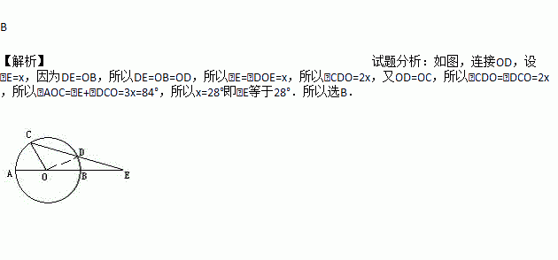 如图,⊙O的直径AB与弦CD的延长线交于点E,若DE=OB,∠AOC=84°,则∠E等于( )
