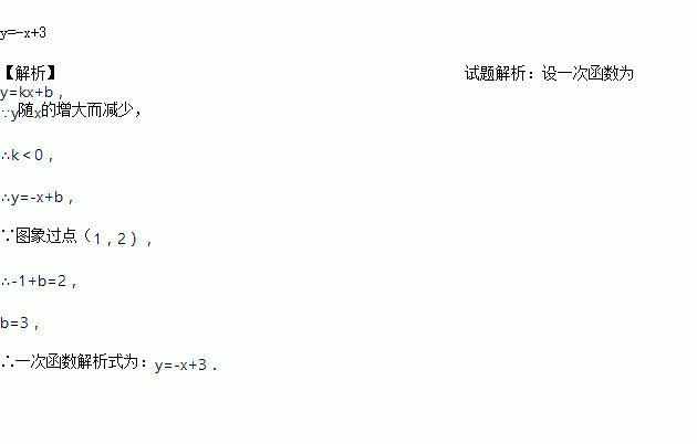已知一次函数图象过(1,2)且y随x的增大则减小,请写出一个符合条件的函数解析式______.