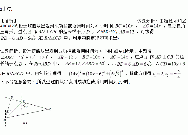 如图,禁止捕鱼期间,某海上稽查队在某海域巡逻,上午某一时刻在A处接到指挥部通知,在他们东北方向距离12海里的B处有一艘捕鱼船,正在沿南偏东75°方向以每小时10海里的速度航行,稽查队员立即乘坐巡逻船以每小时14海里的速度沿北偏东某一方向出发,在C处成功拦截捕鱼船,求巡逻船从出发到成功拦截捕鱼船所用的时间.