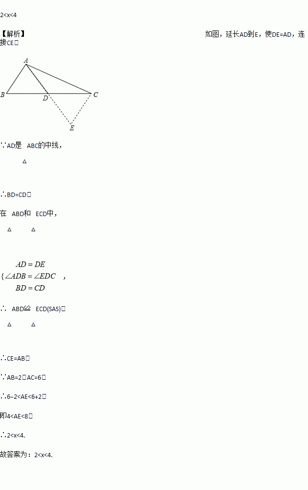 查看答案已知△ABC的两边长分别为AB=2和AC=6,第三边上的中线AD=x,则x的取值范围是______________.