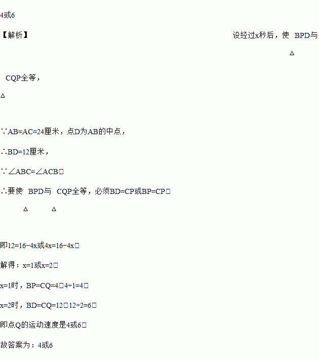 如图,在△ABC中,AB=AC=24厘米,BC=16厘米,点D为AB的中点,点P在线段BC上以4厘米/秒的速度由B点向C点运动,同时,点Q在线段CA上由C点向A点运动.当点Q的运动速度为_____厘米/秒时,能够在某一时刻使△BPD与△CQP全等.