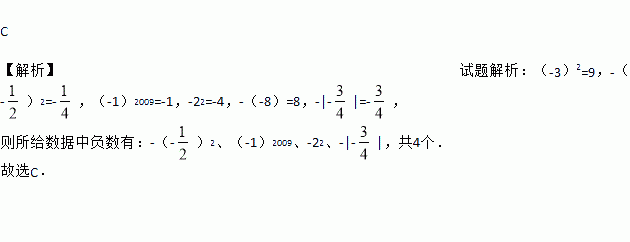 C 【解析】试题解析:(-3)2=9,-(-)2=-,(-1)2009=-1,-22=-4,-(-8)=8,-|-|=-, 则所给数据中负数有:-(-)2、(-1)2009、-22、-|-|,共4个. 故选C.