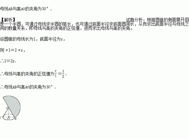 如图,圆锥的侧面展开图是一个半圆,求母线AB与高AO的夹角.