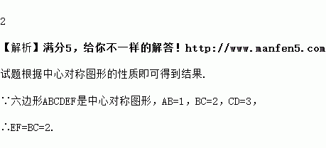 已知六边形ABCDEF是中心对称图形,AB=1,BC=2,CD=3,那么EF=_______.