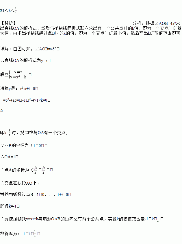 如图,以扇形OAB的顶点O为原点,半径OB所在的直线为x轴,建立平面直角坐标系,其中点B的坐标为(1,0),若抛物线y=x2+k与扇形OAB的边界总有两个公共点,则实数k的取值范围是_____.