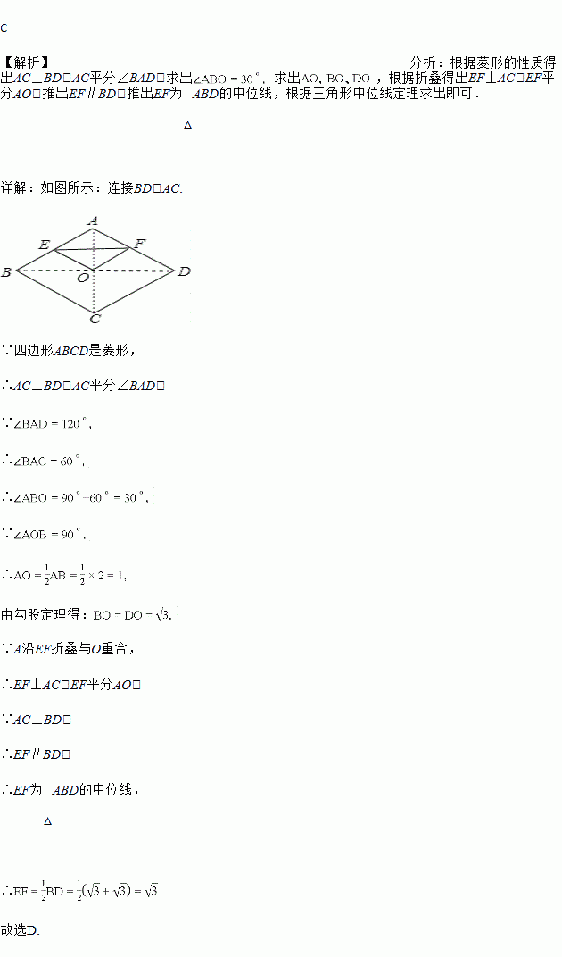 如图,将菱形纸片ABCD折叠,使点A恰好落在菱形的对称中心O处,折痕为EF,若菱形ABCD的边长为2cm,∠A=120°,则EF的长为( )