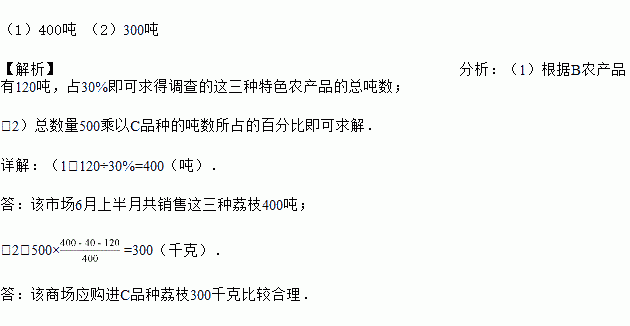 (2)该村民合作社计划6月份销售A、B、C三种特色农产品共500吨,根据该村民合作社5月份的销售情况,问该村民合作社应准备C品种特色农产品多少吨比较合理?