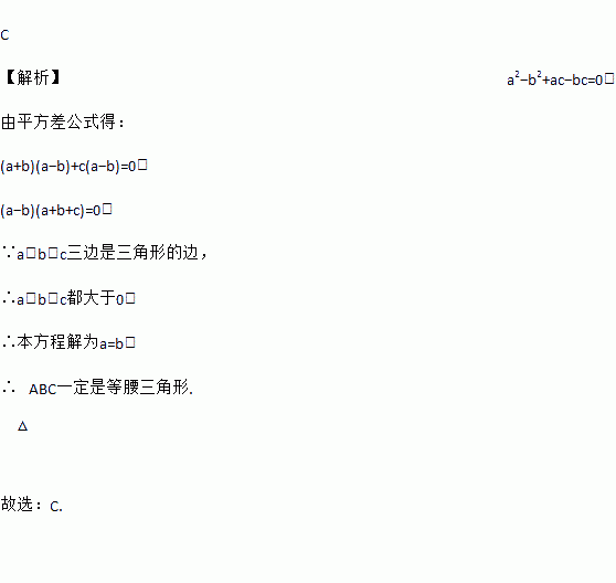 C 【解析】a2?b2+ac?bc=0, 由平方差公式得: (a+b)(a?b)+c(a?b)=0, (a?b)(a+b+c)=0, ∵a、b、c三边是三角形的边, ∴a、b、c都大于0, ∴本方程解为a=b, ∴△ABC一定是等腰三角形. 故选:C.