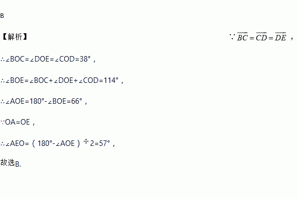 如图,AB是⊙O的直径, ,∠COD=38°,则∠AEO的度数是( )