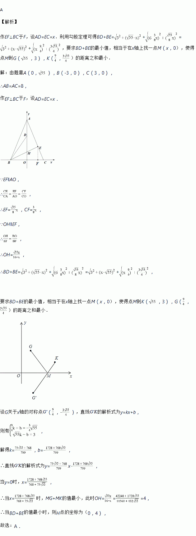 分别交x轴、y轴于点B、A两点,C(3,0),D、E分别为线段AO和线段AC上一动点,BE交y轴于点H,且AD=CE.当BD+BE的值最小时,则H点的坐标为( )