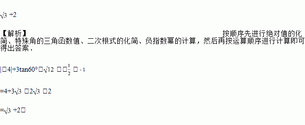计算:|﹣4|+3tan60°﹣﹣()﹣1