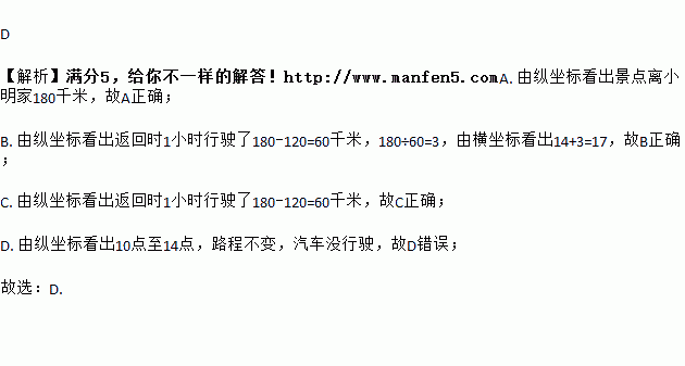 A. 景点离小明家180千米 B. 小明到家的时间为17点