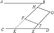 2.分析 延长BF交CD于点K,根据平行线的性质可得出∠B=∠EKF,再由∠B=∠GED可得出∠EKF=∠GED,故可得出BF∥GE.由平行线的性质得出∠HFT=∠FTE,故可得出∠FTE=∠G,进而可得出HG∥FT.