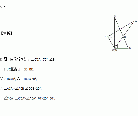 在Rt△ABC中,∠C=90°,∠B=70°,点D在边AB上,△ABC绕点D旋转后点B与点C重合,点C落在点C′,那么∠ACC′的度数是_____.