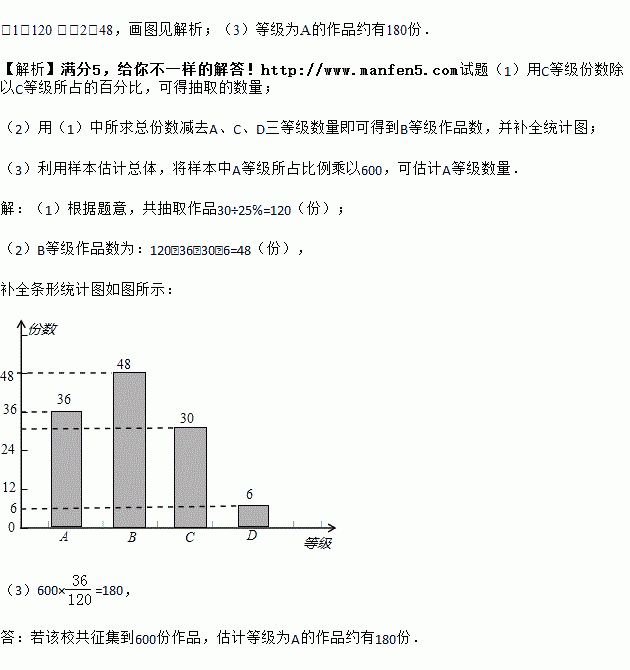 (3)若该校共征集到600份作品,请估计等级为A的作品约有多少份?
