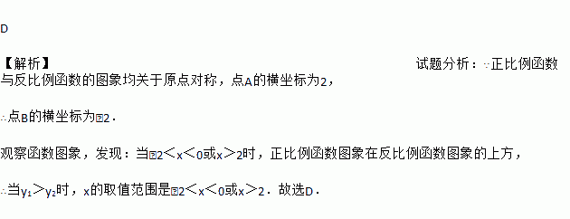 的图象相交于A,B两点,其中点A的横坐标为2,当y1>y2时,x的取值范围是( )