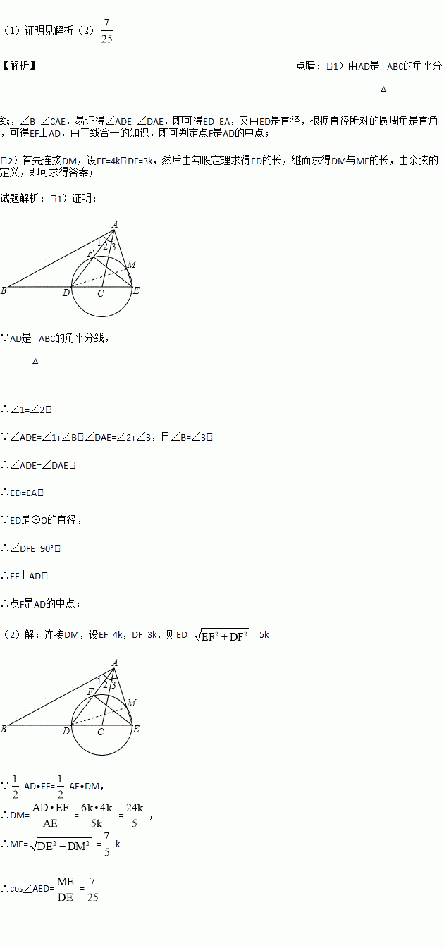 如图,AD是△ABC的角平分线,以点C为圆心,CD为半径作圆交BC的延长线于点E,交AD于点F,交AE于点M,且∠B=∠CAE,EF:FD=4:3.