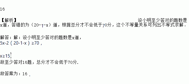 在一次智力测验中有20道选择题,评分标准为:对l题给5分,错1题扣2分,不答题不给分也不扣分,张强有1道题末答,如果总分才不会低于70分,则他至少答对____道题.