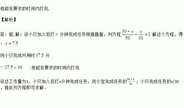 期中考查,信息技术课老师限时40分钟要求每位七年级学生打完一篇文章.已知独立打完同样大小文章,小宝需要50分钟,小贝只需要30分钟.为了完成任务,小宝打了30分钟后,请求小贝帮助合作,他能在要求的时间打完吗?