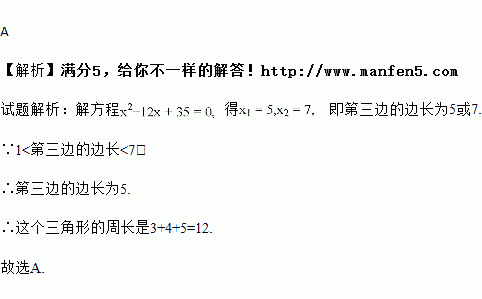 已知三角形的两边长分别是3和4,第三边是方程x2﹣12x+35=0的一个根,则此三角形的周长是( )
