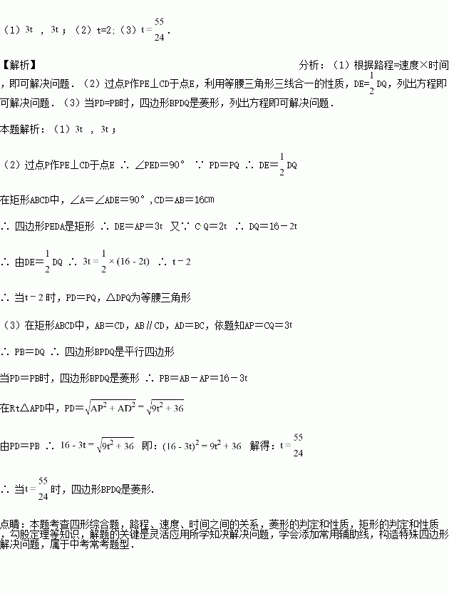 (2)若点P为3cm/s的速度移动,点Q以2cm/s的速度移动,经过多长时间PD=PQ,使△DPQ为等腰三角形?