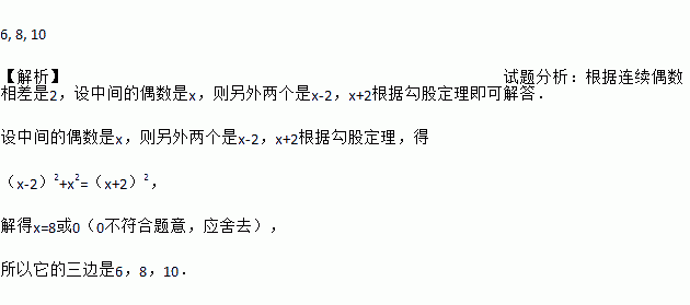 一个直角三角形的三边为三个连续偶数,则它的三边长分别为___________.
