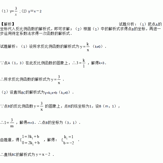 如图,反比例函数的图象经过点A、B,点A的坐标为(1,3),点B的纵坐标为1,点C的坐标为(2,0).