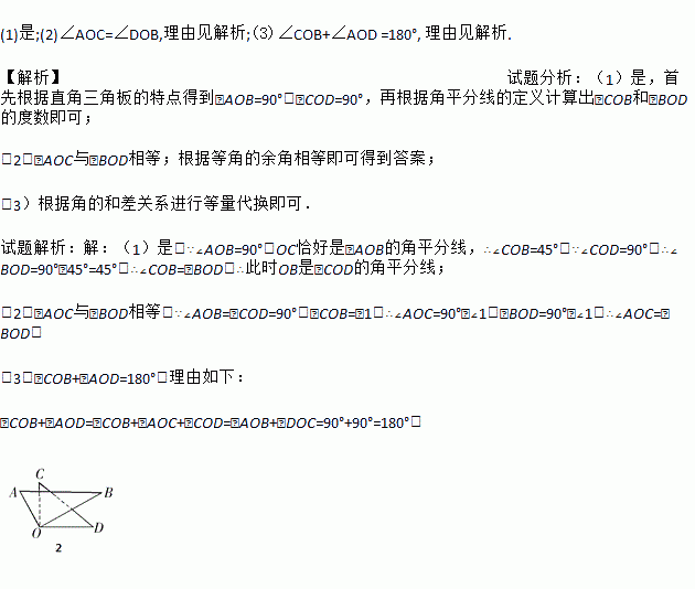 (1)是;(2)∠AOC=∠DOB,理由见解析;(3)∠COB+∠AOD =180°, 理由见解析. 【解析】试题分析:(1)是,首先根据直角三角板的特点得到∠AOB=90°,∠COD=90°,再根据角平分线的定义计算出∠COB和∠BOD的度数即可; (2)∠AOC与∠BOD相等;根据等角的余角相等即可得到答案; (3)根据角的和差关系进行等量代换即可. 试题解析:【解析】...