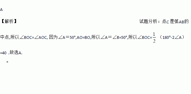 A 【解析】试题分析:点C 是弧AB的中点,所以∠BOC=∠AOC, 因为∠A=50°,AO=BO,所以∠A=∠B=50°,所以∠BOC=(180°-2∠A)=40°.故选A.