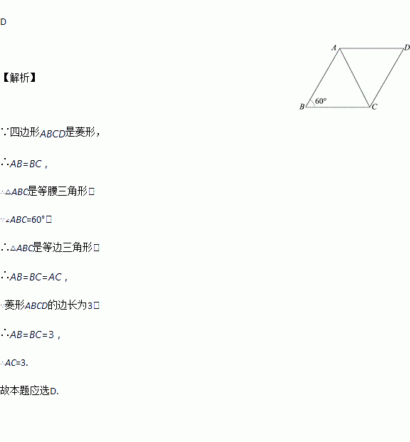 如图,已知菱形ABCD的边长为3,∠ABC=60°,则对角线AC的长是( )